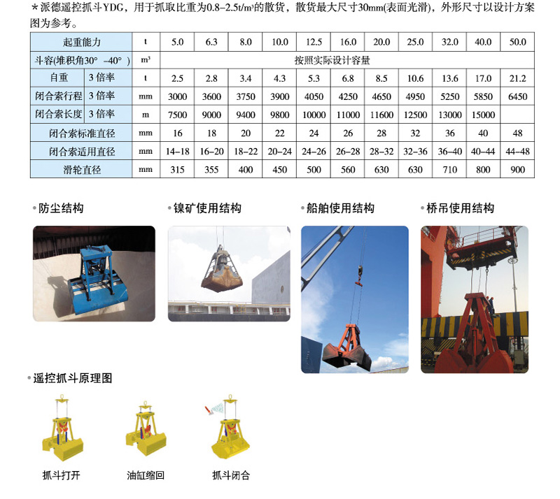 遙控抓斗是一種配合單索起重機(jī)通過無線遙控發(fā)射器來控制打開的新穎抓斗。它不需要外界能源,在料堆上能隨吊鉤的起升自動(dòng)閉合,又能在空中任意位置自動(dòng)打開并可以隨時(shí)停止。抓斗內(nèi)部有蓄電瓶,通過控制電磁閥的開閉來控制抓斗的打開。抓斗不需要其它任何電源,綠色環(huán)保。該抓斗作為一種機(jī)電一體化的新發(fā)明而深受用戶的歡迎。它的誕生改寫了起重運(yùn)輸行業(yè)中單索抓斗效率低下的歷史。遙控抓斗一般由上承梁總成、滑移座總成、下承梁總成、斗體、撐桿以及油缸幾大部件組成。其中上承梁總成和滑移座總成中有與起重機(jī)相連的滑輪組,油缸的筒體及活塞桿分別與下承梁總成及滑移座總成聯(lián)接?;谱梢栽谄鹬貦C(jī)作用下上下滑動(dòng),帶動(dòng)下承梁一起起升,從而帶動(dòng)抓斗閉合;通過遙控器控制下承梁和滑移座的脫開,從而控制抓斗的打開。